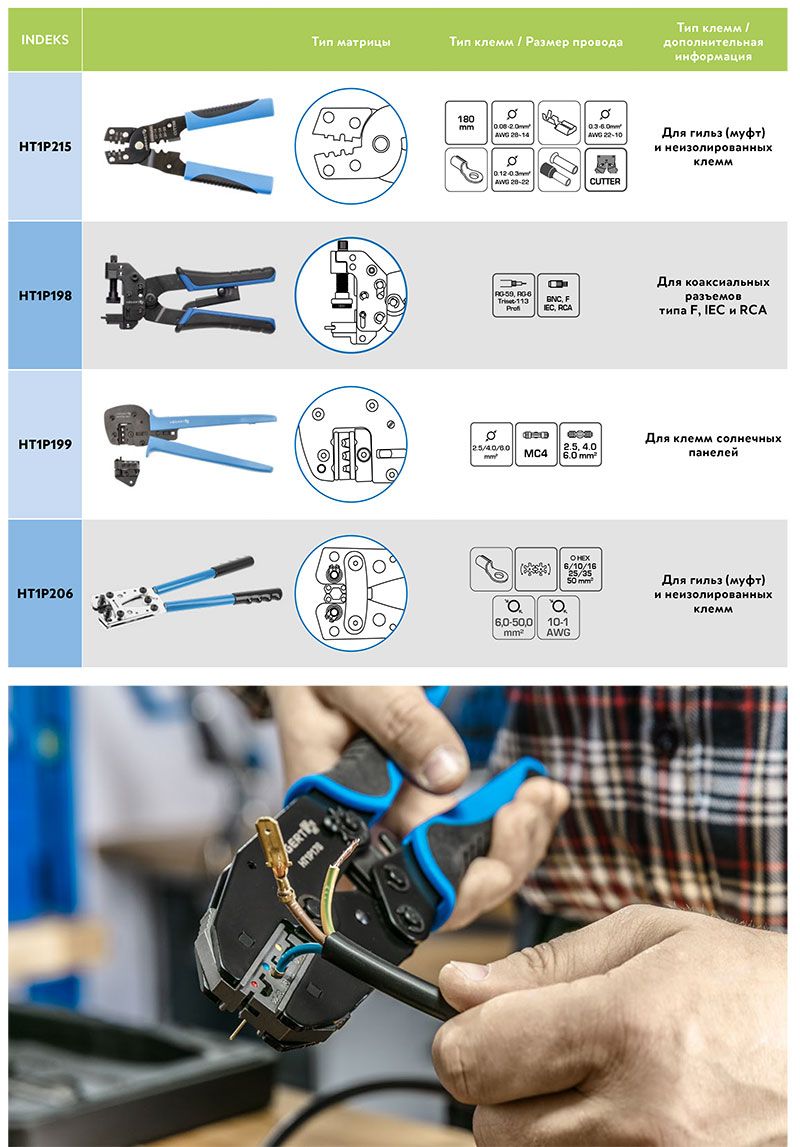 Зная потребности наших клиентов, мы стараемся подобрать наше предложение, чтобы удовлетворить ожидания даже самых требовательных пользователей. Мы знаем, насколько сложна электротехническая промышленность и как важно выбрать правильные инструменты для выполнения своих ежедневных обязанностей, поэтому мы заботимся о качестве и удобстве использования нашей продукции. В задачи нашего бренда никогда не входило использование полумер, поэтому мы поставили перед собой цель расширить наше предложение, чтобы каждый мог найти продукцию, которая будет служить ему долгое время, а выполняемая им работа будет точной и аккуратной. Для того чтобы облегчить выбор подходящих плоскогубцев, мы создали сравнительную таблицу по типу губок и наконечников. Мы также включили информацию о типе сечения проводника, с которым клещи справляются лучше всего. В таблице также содержится информация о типе провода, для которого выбираются клещи. Пожалуйста, ознакомьтесь с нашим предложением.